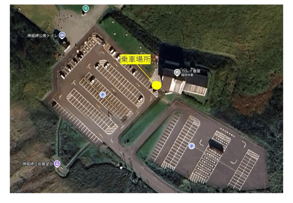 神威岬自然公園散策路の工事に伴い、本来のバス停がある第2駐車場が立入禁止となるため、11月24日(月)に限り、下図で示す箇所へ待合・乗降場所が変更となります。